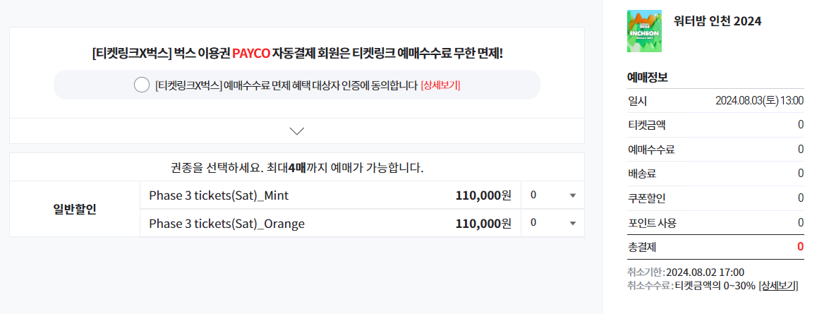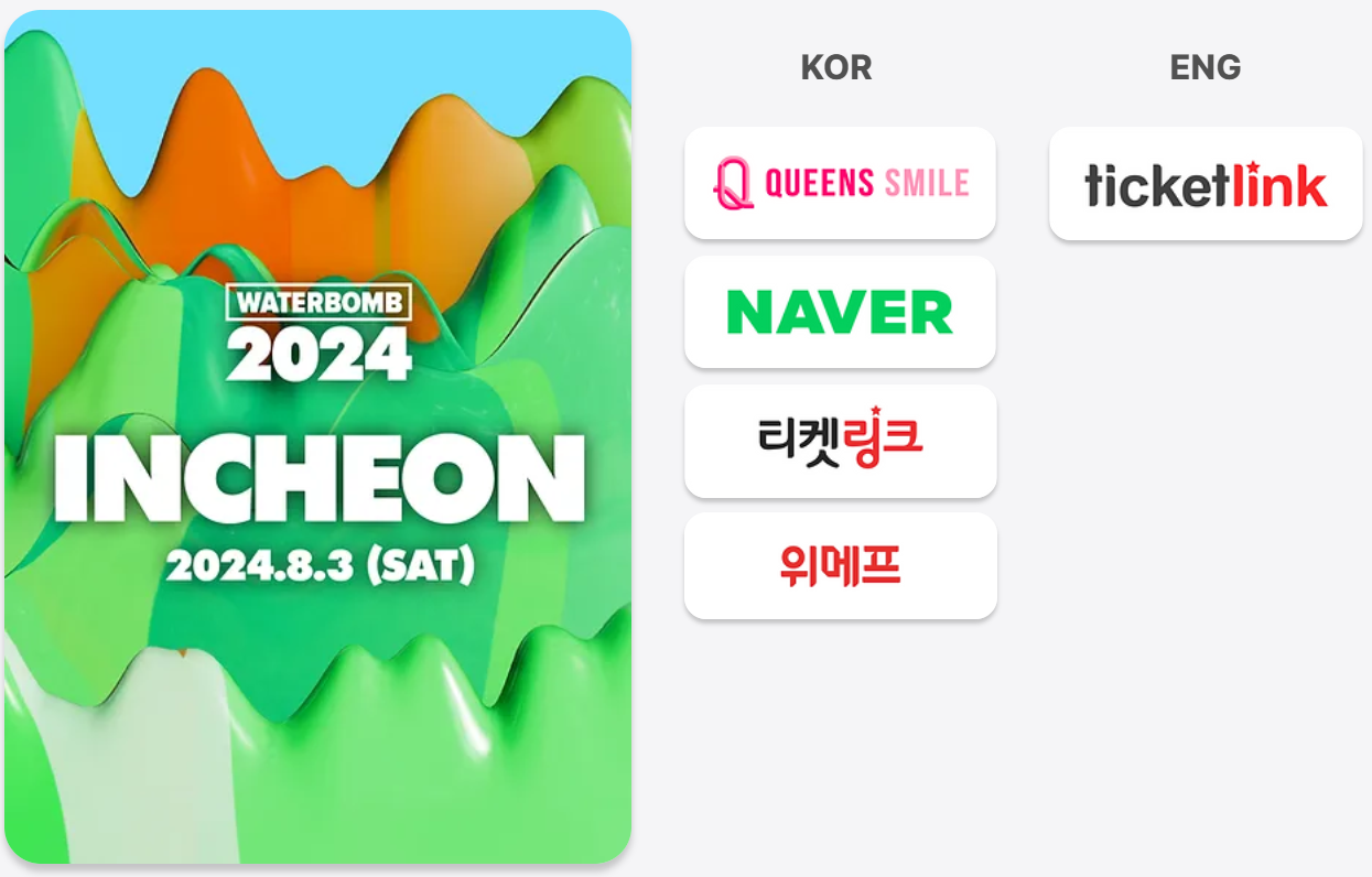 | 3차 | 110,000원 | 워터밤 2024 인천 3회차 티켓 판매중 티켓 예매 바로가기👆 |