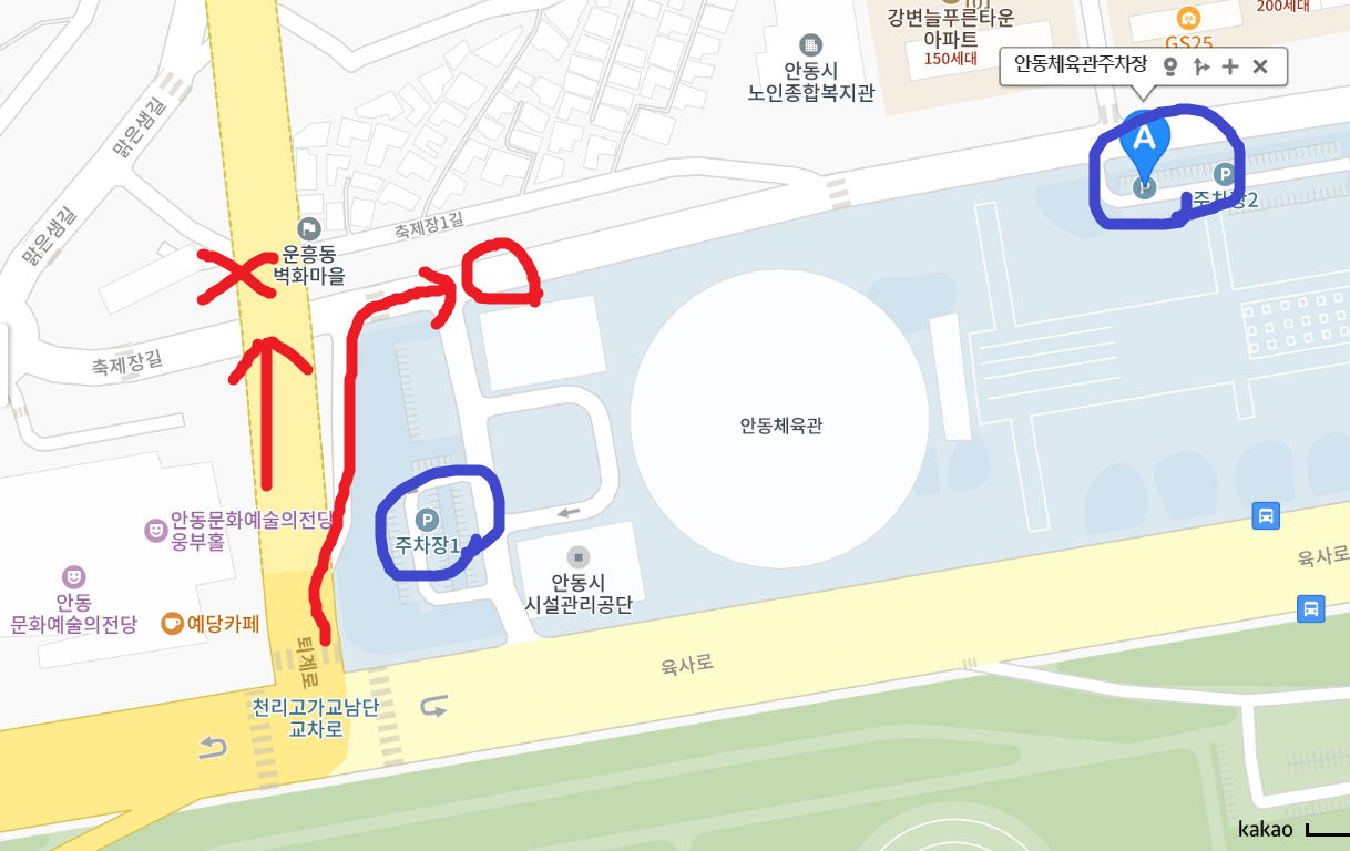 안동체육관 주차장👆의 경우 도착 직전 도로에서 옆 샛길로 빠져야 안동체육관으로 들어갈 수 있습니다.