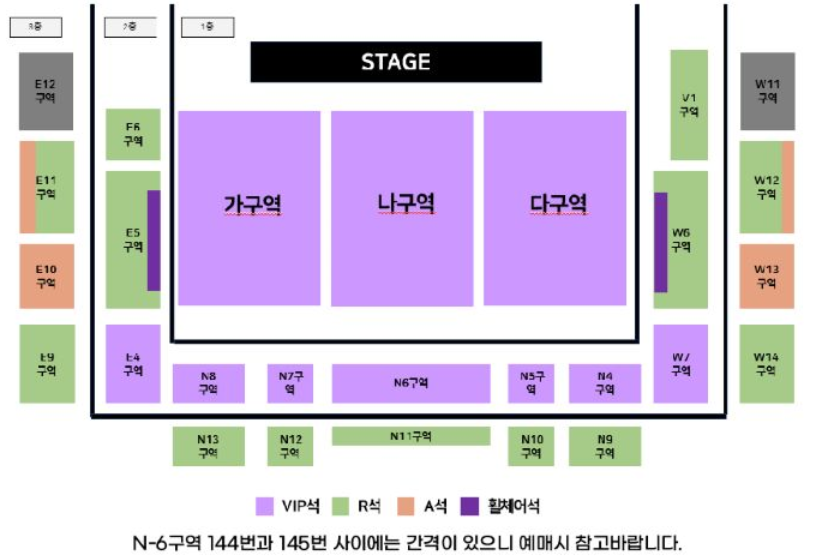 좌석에 따라 좌석 사이 간격이 있을 수 있으니 N-6구역의 144번, 145번 좌석 선택시 참고하시기 바랍니다.